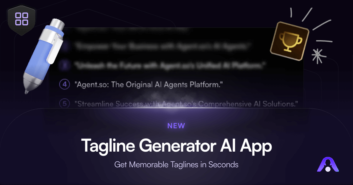 The AI Tagline Generator App is live on Agent.so! Check it out on the Apps realm. You can use it to generate taglines for your products, services, or projects using AI. More AI Apps are coming, so stay tuned!