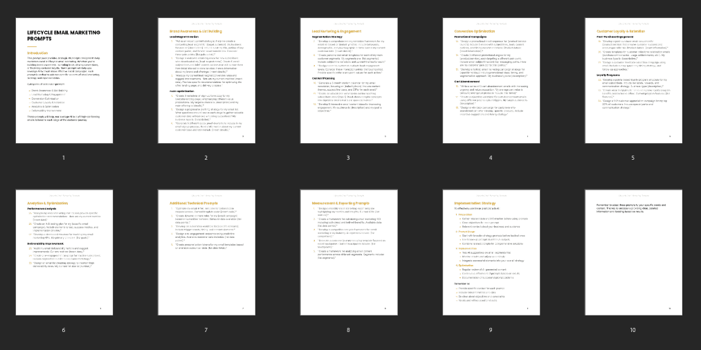 This prompt pack walks you through the essential touchpoints of lifecycle marketing, starting with lead capture and onboarding. You’ll get prompts for building strong lead magnets, writing welcome sequences, and segmenting audiences based on behavior and intent.